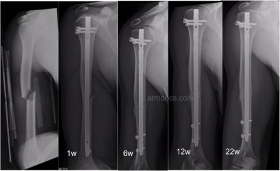 The operation is performed under a combination of general and regional anaesthesia. The fracture may be exposed through an open incision, the bone fragments realigned and then fixed with a plate and screws. Alternatively, the fracture may be realigned by manipulation and fixed with a an intramedullary nail (rod). The fixation may occasionally be supplemented with bone grafting using “off the shelf” bone substitutes or augmented using bone cement.